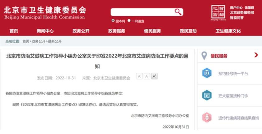 北京市卫健委网站消息,北京市防治艾滋病工作领导小组办公室已将《2022年北京市艾滋病防治工作要点》,印发...