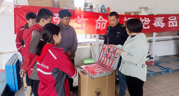 杨庄街道平安建设办公室在京东快递铁西林场营业网点开展禁毒宣传活动,禁毒社工结合仿真毒品模型、禁毒宣传...