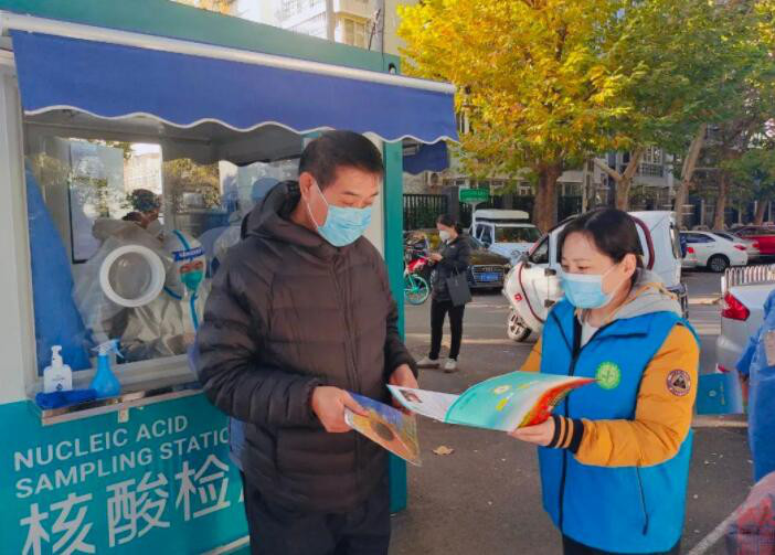 交道口街道在社区核酸检测点开展禁毒宣传教育活动,禁毒社工在做好自身防护的前提下,充分利用广大群众有序...