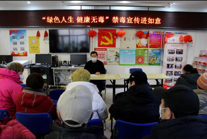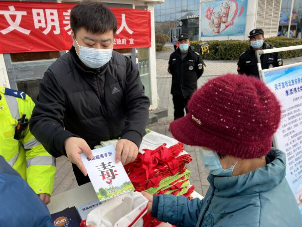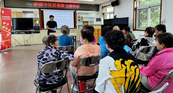 什刹海街道禁毒工作站在护国寺社区开展“参与禁毒 创建和谐社区”宣传活动,禁毒专职社工向社区居民发放禁...