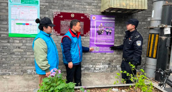 建国门街道组织社区民警、社区治保主任在辖区内开展禁种铲毒踏查与宣传活动,工作人员深入胡同院落、房前屋...