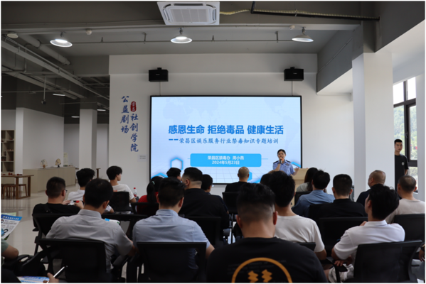 5月23日,荣昌区禁毒办联合区公安局、区卫健委举办娱乐场所从业人员禁毒防艾知识专题讲座,进一步增强全区娱乐场所从业人员的禁毒法律法规意识,提高从业人员的识毒、防毒、拒毒能力,共创健康无毒娱乐场所,全区60余名娱乐场所从业人员参与培训。