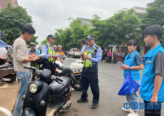中国禁毒网讯 为全力维护道路交通安全环境,提高驾驶员的禁毒意识,4月17日,海南省海口市琼山区大坡镇禁毒办、大坡派出所、交警中队联合开展“拒绝毒驾”宣传活动。