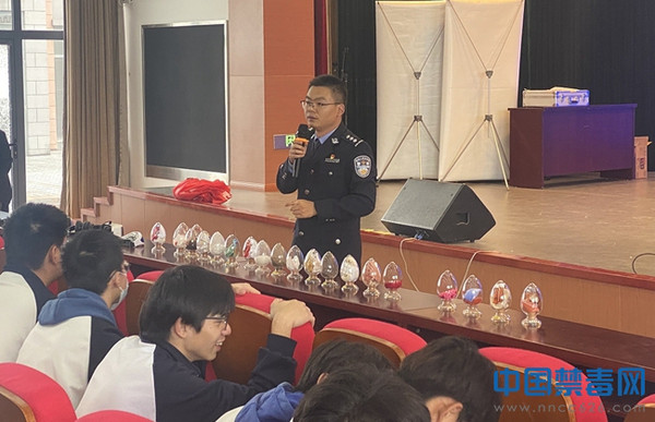 禁毒民警以互动的方式向学生介绍毒品的种类及危害,重点讲解依托咪酯等新型毒品的预防知识。同时,民警为学生送上印有“科技铸盾 远离毒品”“禁毒护苗 雷公马同行”的运动水杯、印有省禁毒委员会标志的鸭舌帽、印有“禁毒护苗 雷公马同行”的T恤衫等慰问品一批。