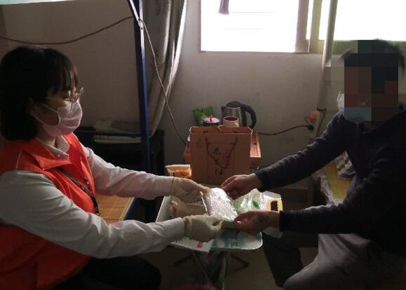 深圳市宝安区西乡街道禁毒办工作人员为戒毒康复人员小袁送去温暖,鼓励其树立积极健康的生活心态,共同抗击疫情,抵制毒品。