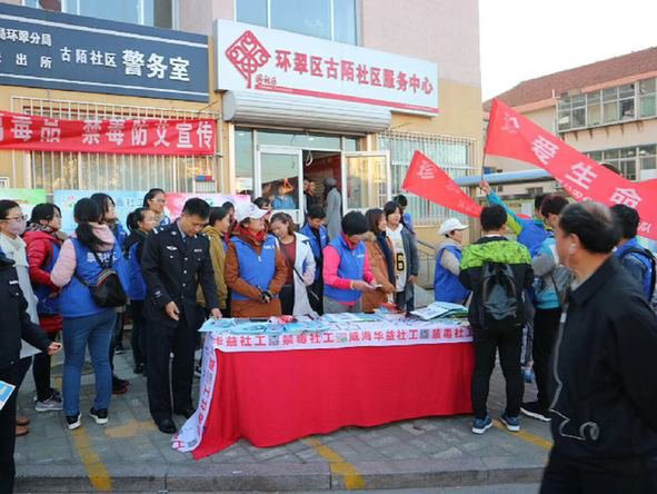 近日,山东威海环翠区禁毒办联合团区委、鲸园街道办事处、威海市社会组织创新创业园、威海华益社工以及来自山大的20多名禁毒志愿者在古陌社区开展禁毒宣传活动。