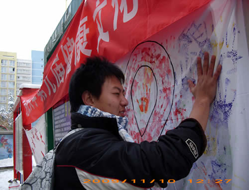 11月10日晚上,由于甲流的原因,我们的室内开幕式没能如期进行。但红十字会不缺乏创新,我们在雨雪之中举办了一场轰轰烈烈的冰雪开幕式,我们尽情的欢呼,庆祝健康文化节的生日,也佩戴着红丝带默默的为艾滋患者祈祷:你们并不孤单。