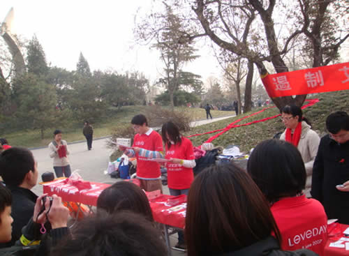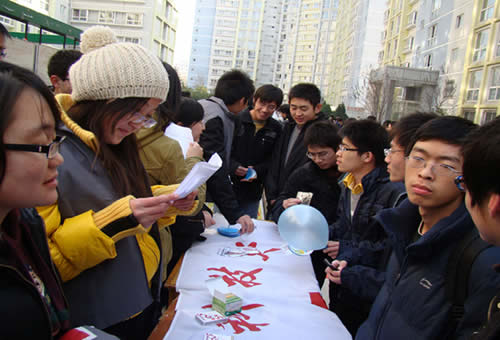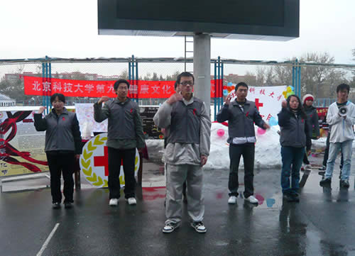 心系红围巾,点滴暖人心:一条美丽的红围巾正在科大学子手中编织与传递15所高校联合在玉渊潭公园举行的红丝带宣传活动