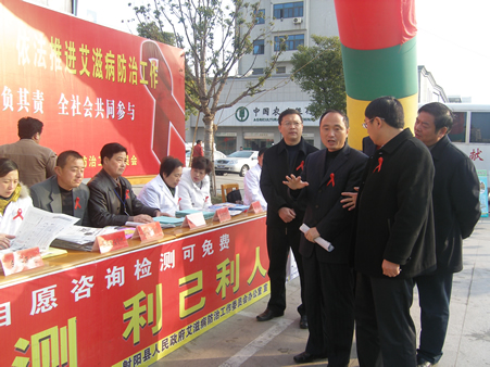 2007年12月1日是第20个“世界艾滋病日”,江苏省射阳县政府艾滋病防治工作委员会紧紧围绕今年“全民动员,遏制艾滋,履行承诺”宣传主题,在该县县城中心广场举办了大型预防艾滋病宣传咨询活动。该县政府艾防委主任、副县长季风亲临现场,兴致勃勃地观看了预防艾滋病图片展,并亲切慰问了现场的工作人员,他对该县各相关部门在预防艾滋病宣传教育方面所作出的贡献表示充分的肯定,并对该县艾滋病防治宣传教育等工作提出了具体要求。该县宣传部、总工会、团委、妇联、计生委、教育局、工商局、规划建设局、卫生局、红十字会等县政府艾防委相关成员单位及该县县城各医疗卫生单位参加了这次活动。