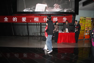 此时的影院大厅变身成了宣传预防艾滋病知识专场,影院大厅醒目处悬挂着“安全的爱、相伴终生”的宣传横幅,防艾知识宣传展板矗立在最为显眼的位置,志愿者们向大家分发红丝带徽章、便携笔记本等小礼物。时值情人节,前来