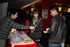 观影的人多为情侣,志愿者们还准备了玫瑰花,送给前来参与问询、现场填写志愿者报名表的情侣们。妇幼保健所的志愿者们还向人群发放了免费婚检与孕产妇HIV免费筛查的相关宣传材料。