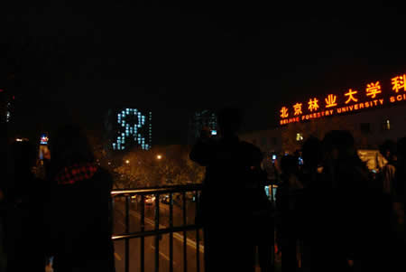 此次活动从9月份学生开学以来,经过一个多月的前期策划、协调、动员等诸多准备工作,10月16日晚上8点整,北京林业大学一栋24层高的女生公寓楼的灯光次第熄灭,亮着灯光的寝室窗口在东侧形成巨大的“红丝带 ”和“心”形图案,在夜空的映衬下,明亮的图案显得格外醒目。同学们纷纷离开宿舍楼,聚集在校园里,马路上、过街天桥上聚集很多志愿者和行人,川流不息的车辆也放慢了速度,大家纷纷拿出相机、手机记录下这有意义的一刻,使整个点亮红丝带活动进入了高潮。虽然点亮红丝带活动只进行了短短的三十分钟,但仍有很多同学和行人停留在校园中和过街天桥上,彼此交换着自己的感受,久久不愿离去。大家都表示这是一次有纪念意义、很特别的宣传活动,在灯光熄灭的瞬间,巨大红丝带呈现在眼前时,许多人的心灵受到了强烈的震撼与感动。