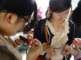 在各队队长的带领下,六个小分队分散开向游客发放预防艾滋病知识宣传册和纪念品。有游人停下匆匆的脚步,听志愿者讲解,并在志愿者的引导下动手制作红丝带,还有游客在领取安全套后与志愿者合影留念。宣传活动并不是一帆风顺,志愿者也遇到了一些困难。由于天坛公园是旅游和休闲的胜地,来此观光的游客和晨练的中老年人占大多数,第一队志愿者在刚开始不久宣传预防艾滋病知识时,遭到了游客拒绝。一些匆忙赶路的游客也摆手走开。活动开始不久,队伍遇到这种情况难免受挫,情绪一度低落,但一队队长及时调整战略,开会商议解决方案,并重新制定了目标人群——中青年群体。他们将做好的红丝带送给目标游客做小礼物,当给游客佩戴红丝带时,另一名小组成员会把手中的安全套和宣传册发给他,并向其简单讲解防艾知识和当前艾滋病传播情况。在赠送红丝带的同时,志愿者们还收集了和游客一起制作的红丝带别在衣服显眼处,有游客看到他们身上的红丝带主动前来询问活动的情况,还提出想要佩戴红丝带的要求。志愿者在引起游客关注后所进行的防艾知识分享,立刻使局面由被动变主动。三队有志愿者把目光集中到带小孩游玩的家长身上,他们教家长和孩子制作红丝带别在身上,一家人还共同写下预防艾滋的标语。一个五六岁大的小女孩并不灵活地为志愿者带上红丝带。一些游客听过志愿者讲解后,和志愿者一起摆出形如“HIV”造型。此次外展中,有志愿者运用自己出色的口语热情地和外国游客讲解交流,几位外国游客还用自己的母语为防艾写下了寄语。