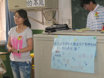 下午三点二十分,活动正式开始,在同伴教育主持人介绍了一些艾滋病基本知识后,同学们纷纷发表自己对艾滋病的看法和疑惑,并就“唾液是否是高危体液”,“公用刮胡刀是否是危险行为”等问题展开了讨论,最终在主持人的引导之下都找到正确的答案。此外,在为时90分钟的活动中,主持人与同学们进行了良好的互动,在一些引导性的游戏中,寓教于乐,使同学们在玩乐当中,不经意就掌握了艾滋病的传播和预防等等各方面的知识,懂得了要珍爱生命,保护自己,不歧视艾滋病感染者,尊重他们。活动结束后,同学们纷纷表示收获很大,希望这样的活动能多举办,惠及更多的同学。