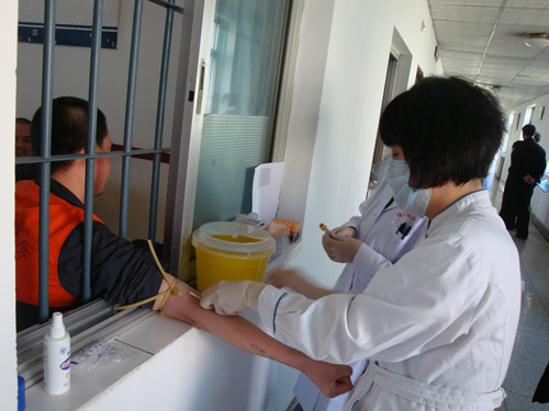 监管场所羁押人群是艾滋病防治的重点对象,其感染情况直接影响艾滋病的传播速度。为了及时掌握监管场所羁押人员中艾滋病病毒感染情况,为监管场所管理人员相应防护措施提供依据、为防止职业暴露提供信息、为制定艾滋病防治政策和措施提供依据, 2011年9月22日上午,顺义区疾控中心、区医院、区看守所和马坡镇卫生院的医务及警务人员联合开展监管场所羁押人员艾滋病病毒抗体筛查工作,顺利完成685名羁押人员的登记和采血工作。