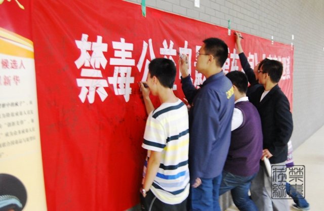 志愿者纷纷在印有“珍爱生命、远离毒品”字样的横幅上签名。