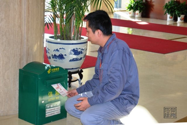 大厦职工将填写好的明信片投进信箱(杨彬/摄)