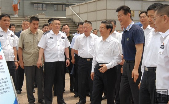 图为郭声琨仔细观看活动现场摆放的禁毒宣传展板