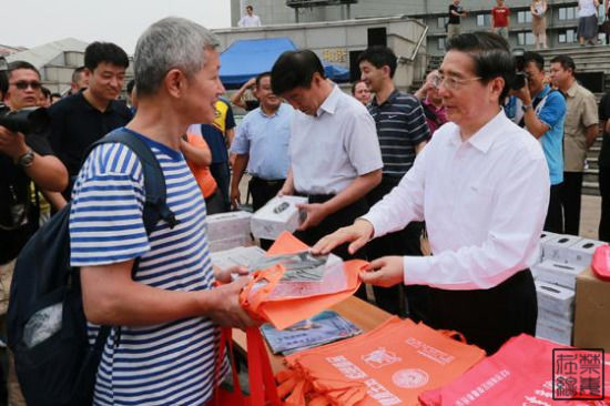 图为郭声琨与参加禁毒宣传活动的工作人员亲切交流