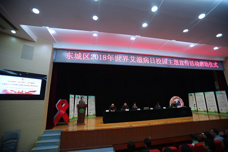 2018年11月30日下午,由东城区防治艾滋病工作委员会办公室、东城区卫生和计划生育委员会,东城区教育委员会主办,东城区疾病预防控制中心、东城区中小学保健所承办,北京景山学校协办2018年“世界艾滋病日”进校园主题宣传活动,在景山学校多功能厅隆重举行。东城区副区长刘俊彩,区卫计工委书记贾红梅、主任林杉、副主任林刚,区教委主任周玉玲、副主任段勇及区防艾委成员单位相关领导以及景山学校部分学生约400余人参与了此次宣传活动。