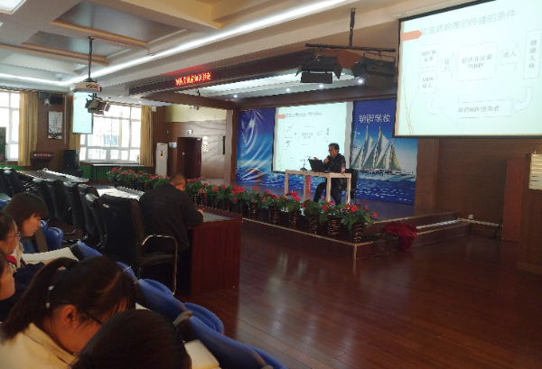 2018年12月1日是第31个“世界艾滋病日”,为了宣传艾滋病相关知识,提高我辖区青少年防艾意识,使其珍爱生命,远离毒品。2018年11月28日下午,朝阳区疾病控制中心性病艾滋病科胡尧为我区东风乡华中师范一附属朝阳分校学生及老师们举办了预防艾滋病知识的专题讲座。