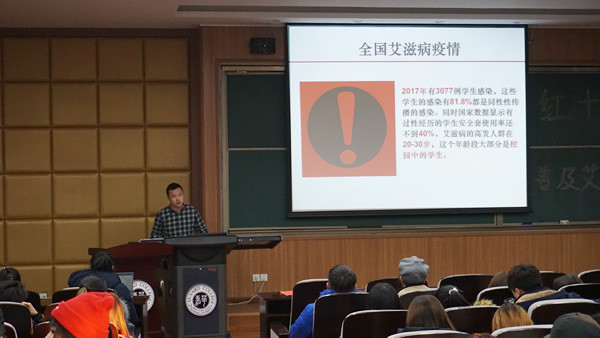 性艾所科长李震以“艾滋病基本知识”为题,借助动画、图片、案例等通俗易懂又轻松愉快的形式,为学生们讲解了艾滋病的历史、传播途径及国家政策等多方面内容,让学生们在倾听和思考中,掌握艾滋病的预防措施及暴露后处理原则,提高自我保护的意识和能力并倡导消除歧视。学生们听的津津有味,积极参与互动问答,授课效果特别好。