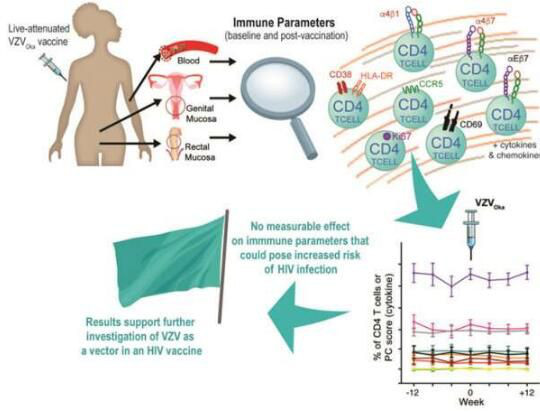 研究者在受HIV严重影响的肯尼亚地区进行了这项研究,他们招募了44名健康、HIV阴性的女性参与者,这些参与者感染HIV的风险较低,水痘免疫测试呈阳性;研究人员给予参与者一种仅抵御水痘病毒的高剂量疫苗,随后每隔4周、8周及12周检测每一名参与者的血液、宫颈粘膜细胞以及直肠粘膜细胞。研究结果表明,在接种疫苗12周后,相比接种疫苗前个体在激活HIV靶向细胞的频率上并无显著差异。