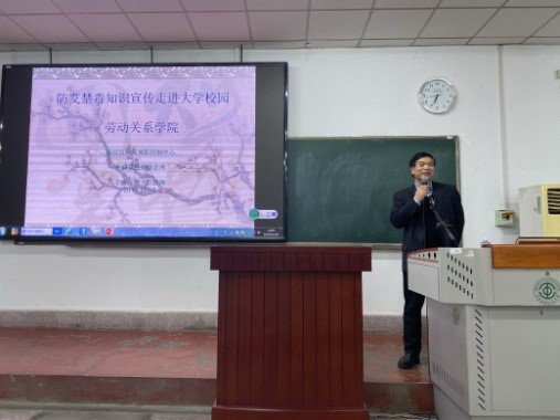 艾滋病是一种慢性传染性疾病,主要通过血液、母婴和性接触方式在人群中进行传播,目前已经由高危人群转到普通人群,尤其是青年学生感染情况备受关注,海淀区多年来采取多种方式对大学生进行防艾知识宣传, 11月18日晚在2019年世界艾滋病日到来之前,海淀区疾病预防控制中心性病艾滋病防治科医师王路,专程到劳动关系学院涿州校区阶二教室为学生做艾滋病防控知识专题讲座。