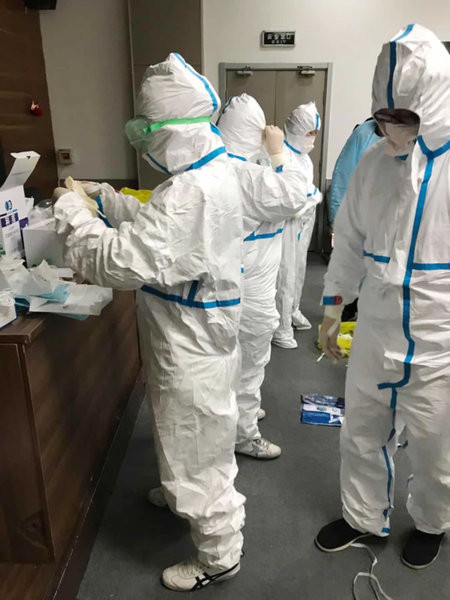 随后,黄立勇、丁海峰陪同当日承担采样工作的医生和护士一起进入隔离区,对5名密切接触者进行标本采集的全过程进行现场指导;对采样和脱防护服的过程中如何开展辅助消毒进行了培训。全部工作完成时已是深夜11点钟。