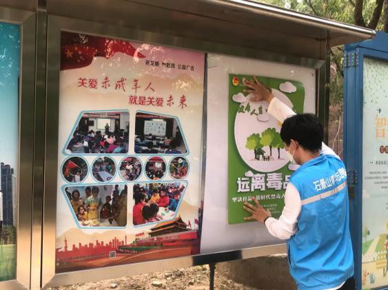 石景山区青年志愿者在社区张贴禁毒宣传海报