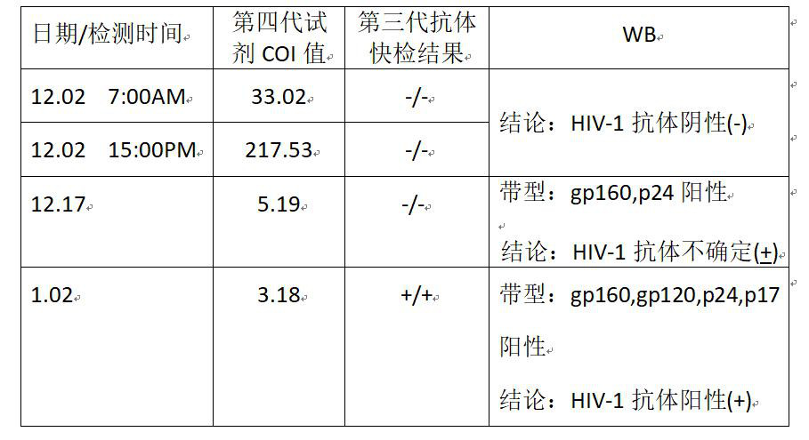 主治医师和检验科多次与该患者沟通,建议尽快去上级医院做HIV RNA实验,未接受,建议随访复查。该患者于当月17日和次月2日两次到我院复检,综合多次检测结果如下: