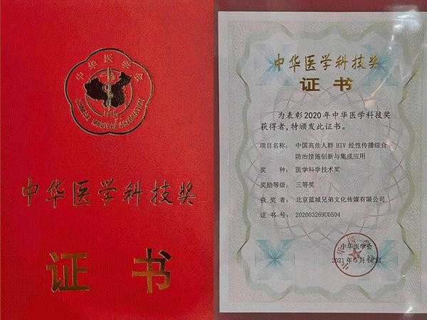 近日,中华医学会公布2020年“中华医学科技奖”获奖名单,北京蓝城兄弟文化传媒有限公司(以下简称“蓝城兄弟”)携手中国疾病预防控制中心艾滋病预防控制中心、复旦大学、云南省疾病预防控制中心、北京市疾病预防控制中心等,共同完成的《中国高危人群HIV经性传播综合防控措施创新与集成应用》项目,荣获“中华医学科技奖”三等奖。