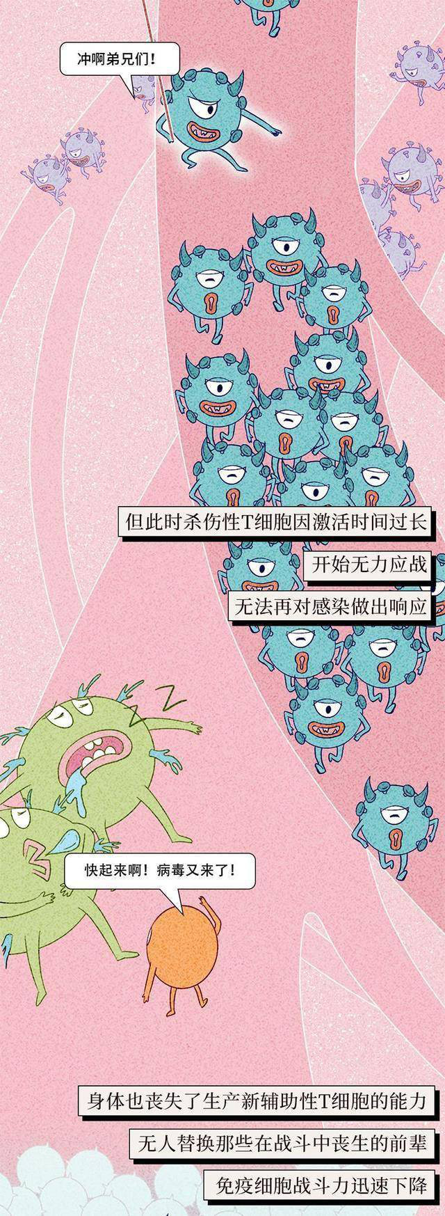 进入身体之后,主要损伤淋巴细胞中的CD4细胞和吞噬细胞,造成身体抵抗力下降,然后就容易出现各种机会性的感染,出现肿瘤。
