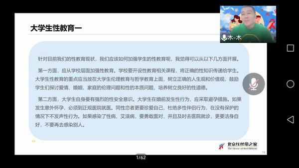 为了更好的向青年学生传授预防艾滋病知识和技能,改变他们的知信行,减少艾滋病传播,2022年6月26日,房山区疾控中心联合房山区大学城各高校、北京地坛医院红丝带之家通过腾讯会议的形式成功举办了以“禁毒防艾”为主题的网络直播讲座,近200名师生参与了此次线上讲座。