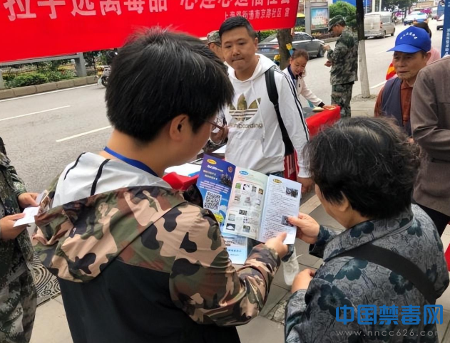 图为禁毒志愿者向群众发放禁毒宣传彩页。中国禁毒网发