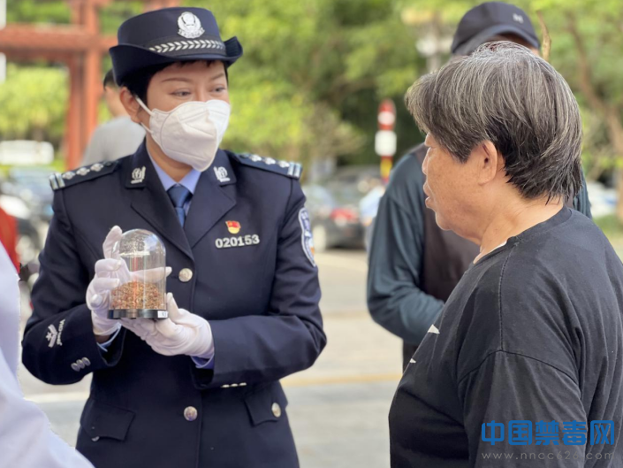 图为禁毒民警向群众展示毒品仿真模型。中国禁毒网发