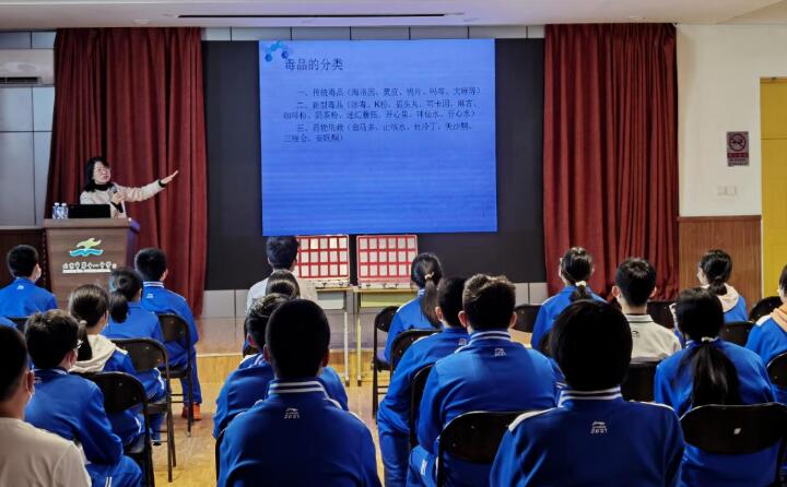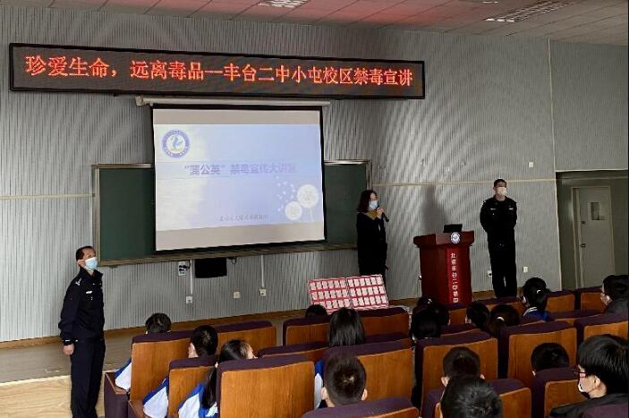 卢沟桥街道平安建设办公室联合北京天康戒毒康复所民警走进丰台二中小屯校区开展禁毒法治宣传教育活动。禁毒民警详细向同学们讲解了毒品的类别、危害以及如何抵御毒品诱惑等知识,告诫同学们一定要增强自我保护意识,自觉抵制毒品诱惑,不让坏人有可乘之机。此次活动的开展,进一步扩大了禁毒宣传的覆盖面,为建设平安无毒校园打下了良好基础。