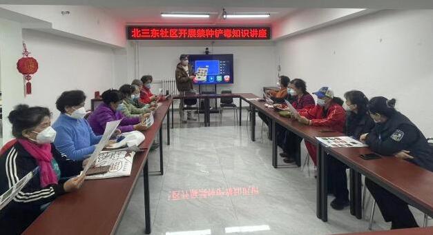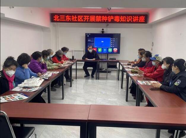 天北街道禁毒工作领导小组办公室走进北三东社区开展禁种铲毒宣传讲座,禁毒社工和禁毒志愿者组织居民群众以“不漏一处,不放一株,不留死角”为工作宗旨,对社区进行了全面踏查,未发现毒品原植物种植现象。禁毒社工同时还向社区居民发放禁毒宣传资料,为大家讲解毒品原植物特征、非法种植毒品原植物的违法性和危害性,呼吁在座居民积极举报非法种植等违法犯罪行为,切实加强了广大群众的禁种铲毒意识。