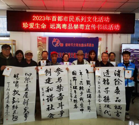 天北街道禁毒工作领导小组办公室联合天南街道走进天通苑二社区开展禁种铲毒宣传活动,社区书法班里的老师们用一幅幅反映禁毒文化的大字表示与毒品作斗争的决心,为建设美好明天、无毒社区奉献自己的力量;禁毒社工向参与活动的居民发放宣传资料,讲解毒品原植物的特征和毒品的危害等知识,呼吁广大群众争当禁毒宣传员,积极参与禁种铲毒工作,营造了浓厚的禁毒氛围。