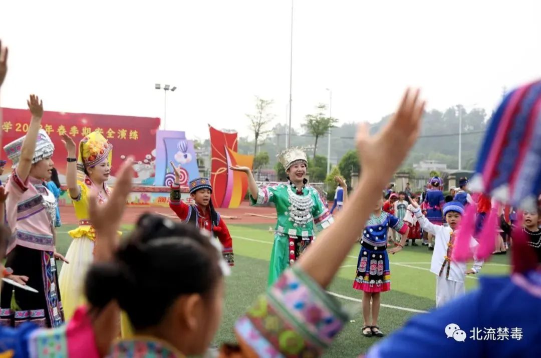 在北流市东湖小学、城北家龙小学校园里,禁毒专干走进对歌现场,和穿着鲜艳民族服装的师生“歌手们”一起进行山歌角逐,你方唱罢我方登场,这边唱来那边和,娓娓动听的禁毒山歌声嗨翻了整个活动现场。“歌手们”以大家喜闻乐见的民间山歌对唱形式唱响禁毒山歌,让禁毒教育在欢乐祥和的气氛中入心入脑。