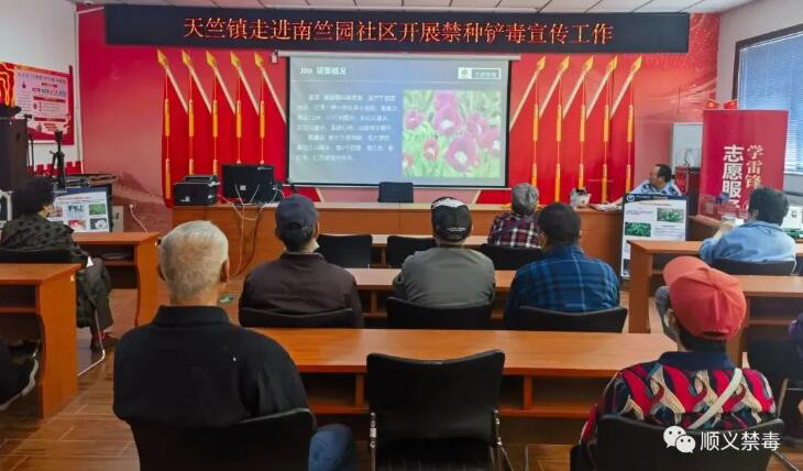 天竺镇禁毒工作小组在南竺园社区服务站开展禁毒宣传活动,组织南竺园小区保安、志愿者和居民观看禁种铲毒工作指南宣传片,并为大家介绍了如何辨别毒品原植物、如何细致全面地开展踏查等知识,让“种毒违法、种毒必铲、种毒必究”的法制观念更加深入人心,为深入开展禁种铲毒工作打下了坚实基础。