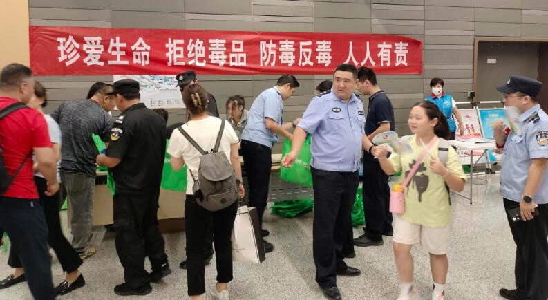 8月11日上午,朝阳区禁毒办、公安分局结合夏季治安宣防和春夏平安行动,联合区交通委、朝阳站管委会、朝阳站内派出所、东风乡、东风派出所等单位,在北京朝阳站开展暑运禁毒预防宣传活动。在现场,以“珍爱生命、拒绝毒品、防毒反毒、人人有责”为主题的禁毒标语,吸引了大量过往游客驻足观看。民警和禁毒专职工作人员为游客解答禁毒方面的问题,指导大家识破新型毒品变换多样的伪装,教育青少年朋友拒绝陌生人提供的食品饮料,提升大家识毒、拒毒、防毒的意识和能力。游客们认真倾听工作人员讲解,详细了解禁毒法律法规和毒品知识,领取禁毒宣传读本,并纷纷表示:毒品害人、害己、害社会,今后要主动抵制毒品,积极参与禁毒斗争,为构建文明和谐的社会环境贡献一份力量。