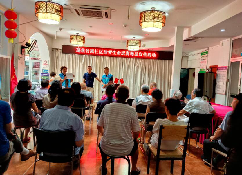 北七家镇蓬莱公寓社区禁毒专干及居委会工作人员在社区内组织开展以“珍爱生命 远离毒品”为主题的禁毒宣传活动,通过派发禁毒宣传资料、摆放禁毒知识展板等方式,向居民群众传达禁毒工作方面的政策法规以及防毒拒毒的基本知识,揭示吸毒对个人、家庭、社会的严重危害,发动群众积极参与禁毒斗争,教育引导群众同毒品违法犯罪行为作斗争,构筑了全民防范毒害侵袭的防护墙,有效增强了广大群众的法制观念和禁毒意识。