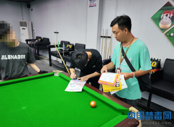 活动中,工作组对辖区内棋牌室、KTV等休闲娱乐场所进行排查,派出所民警现场检查重点场所的日常巡查登记台账本,询查落实禁毒相关安全责任的情况,提醒各个场所负责人要提高警惕,如发现消费者有可疑行为或携带违禁物品、吸毒工具等要及时上报公安机关。街道禁毒工作人员向场所从业人员和现场消费者派发禁毒宣传资料,讲解毒品的危害及防范毒品的知识,告知要提高警惕,加强自我保护意识,远离毒品,鼓励大家发现涉毒违法行为要及时举报。