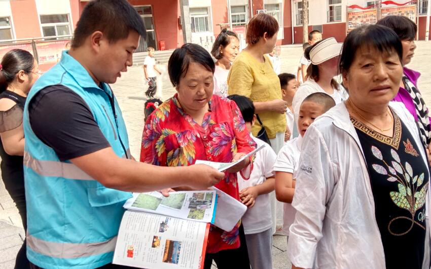 长沟镇禁毒专职社工在长沟中心小学门口,向前来报到的学生及家长讲解禁毒知识。