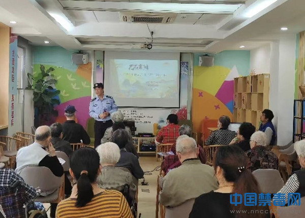 图为禁毒专干向老人们讲解禁毒相关知识。中国禁毒网发