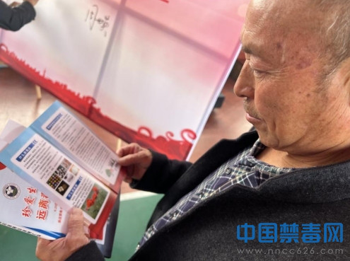 图为老人阅读禁毒宣传彩页。中国禁毒网发