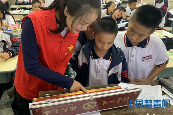 图为禁毒社工向学生展示毒品仿真模型。中国禁毒网发