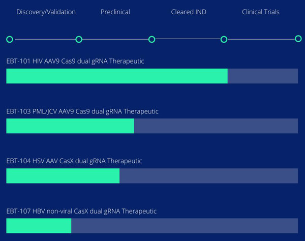 除了基于CRISPR的艾滋病疗法之外,该公司的研发管线还包括使用CRISPR技术清除乙肝病毒(HBV)、单纯疱疹病毒(HSV)、乳头多瘤空泡病毒(JCV)。