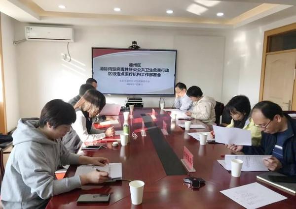 丙型病毒性肝炎(简称“丙肝”)是我国面临的重大传染性疾病之一,根据《北京市卫生健康委员会关于印发消除丙型肝炎公共卫生危害行动实施方案(2021-2030年)》(京卫疾控〔2023〕47号)要求,为有效控制通州区丙肝疫情传播风险,助力实现2030年消除丙肝公共卫生危害目标,保障人民群众身体健康,2023年11月8日,通州区召开消除丙型病毒性肝炎公共卫生危害行动区级定点医疗机构工作部署会,区卫生健康委公共卫生科负责人赵春艳、区疾控中心主管主任戚广浩及相关工作人员,潞河医院、友谊医院通州院区,人民医院通州院区主管领导、相关科室负责人参加会议。